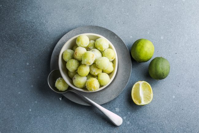 ボウルにぶどうを入れ、ライムを絞り入れて全体にからめる。