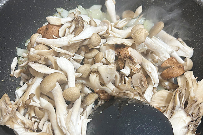 - キノコ(シメジ、舞茸、マッシュルームなどを小分けまたは薄切りにする)・・・300g