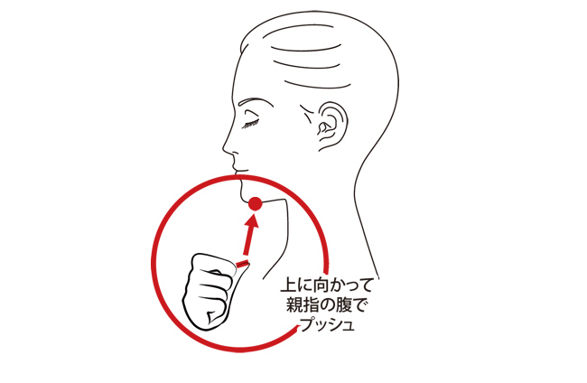 あごの真下の少しくぼんだ部分には、二重アゴ・たるみの解消に効果的なツボ「上廉泉(じょうれんせん)」があります。この「上廉泉」に親指の腹を当て、上に向かってプッシュ。痛過ぎるのはNGですが、少し強めの圧で行います。