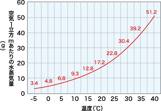 グラフは、空気の中にどれくらい水蒸気を含むことができるか(飽和水蒸気量)を「g」で表したものです。たとえば、気温が30℃のときは30.4g/㎥、15℃の時は12.8g/㎥がマックス。つまり、湿度100%の状態です。湿度50%というのはそれぞれ半分。30℃なら15.2g、15℃なら6.4gの水分を含んでいることになります。